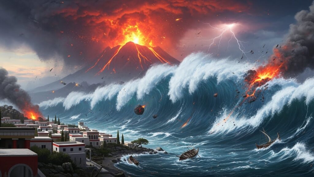 - 出来事: 大規模な火山噴火が発生し、島の一部が吹き飛び、巨大な津波(カルデラ崩壊)が発生。ミノア文明は壊滅的な打撃を受けました。
